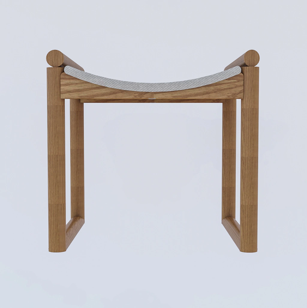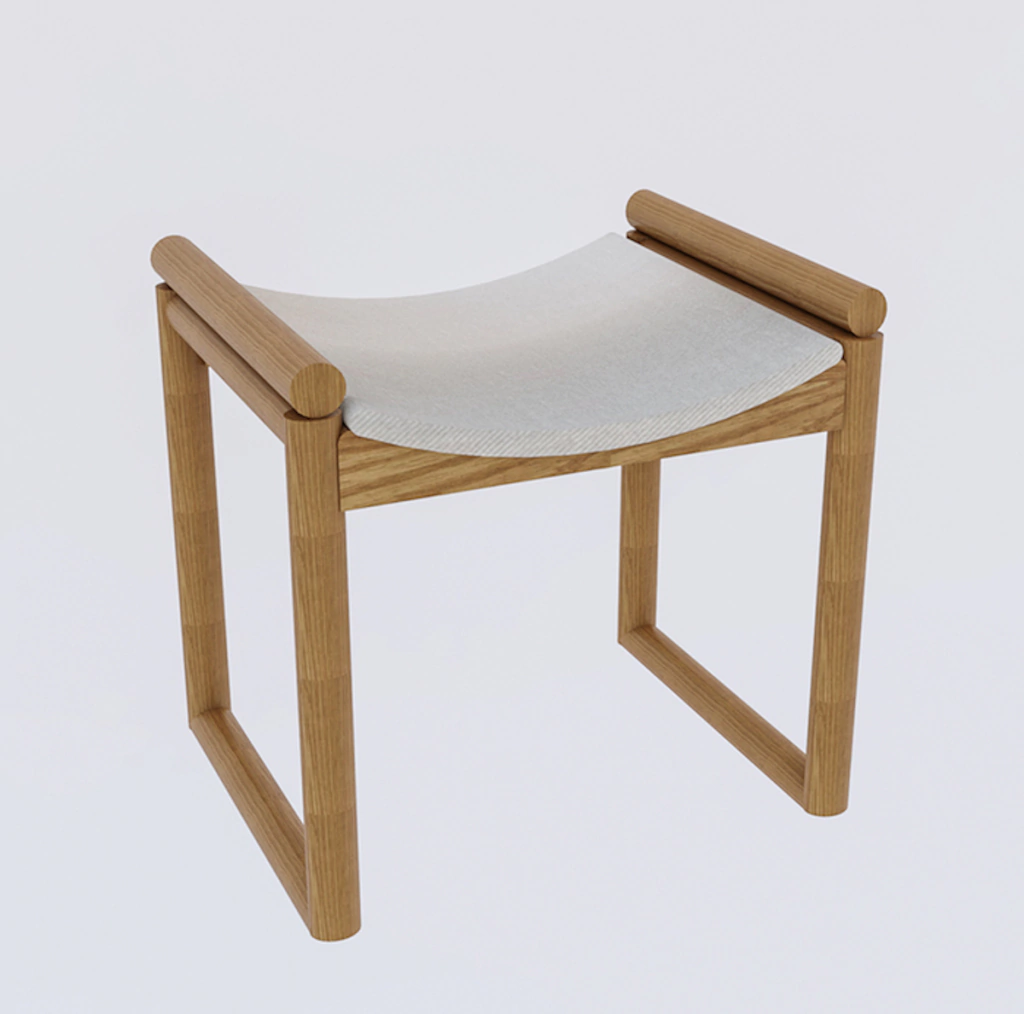 Banco em madeira Jequitibá com revestimento tipo couro vegano nas cores branco e marrom.